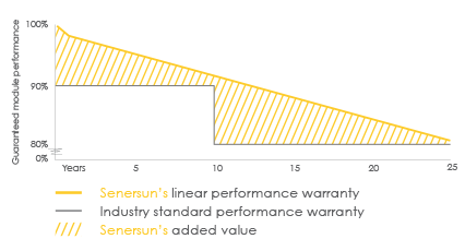 Senersun panels are guaranteed for 25 years. They benefit from a 10-year product warranty on materials and workmanship, and a 25-year linear power output warranty.