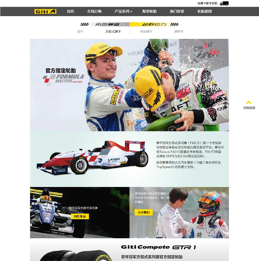 The site includes many mini sites for specialty tires, different tire types ranging from passenger cars to racing tires for Formula 1 each with their own unique designs and special presentations.