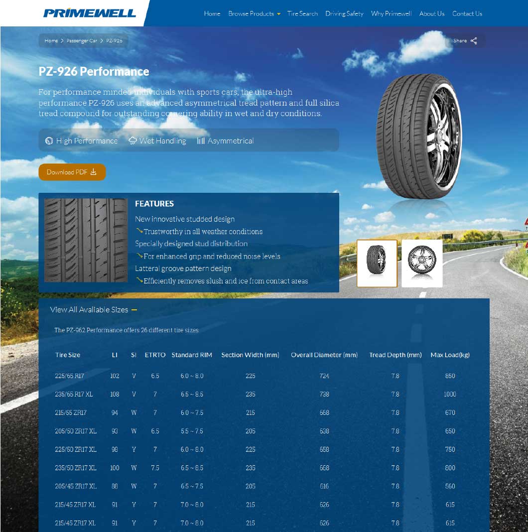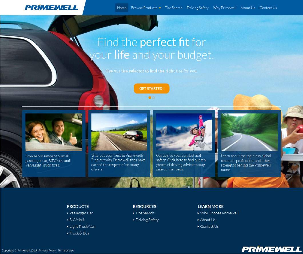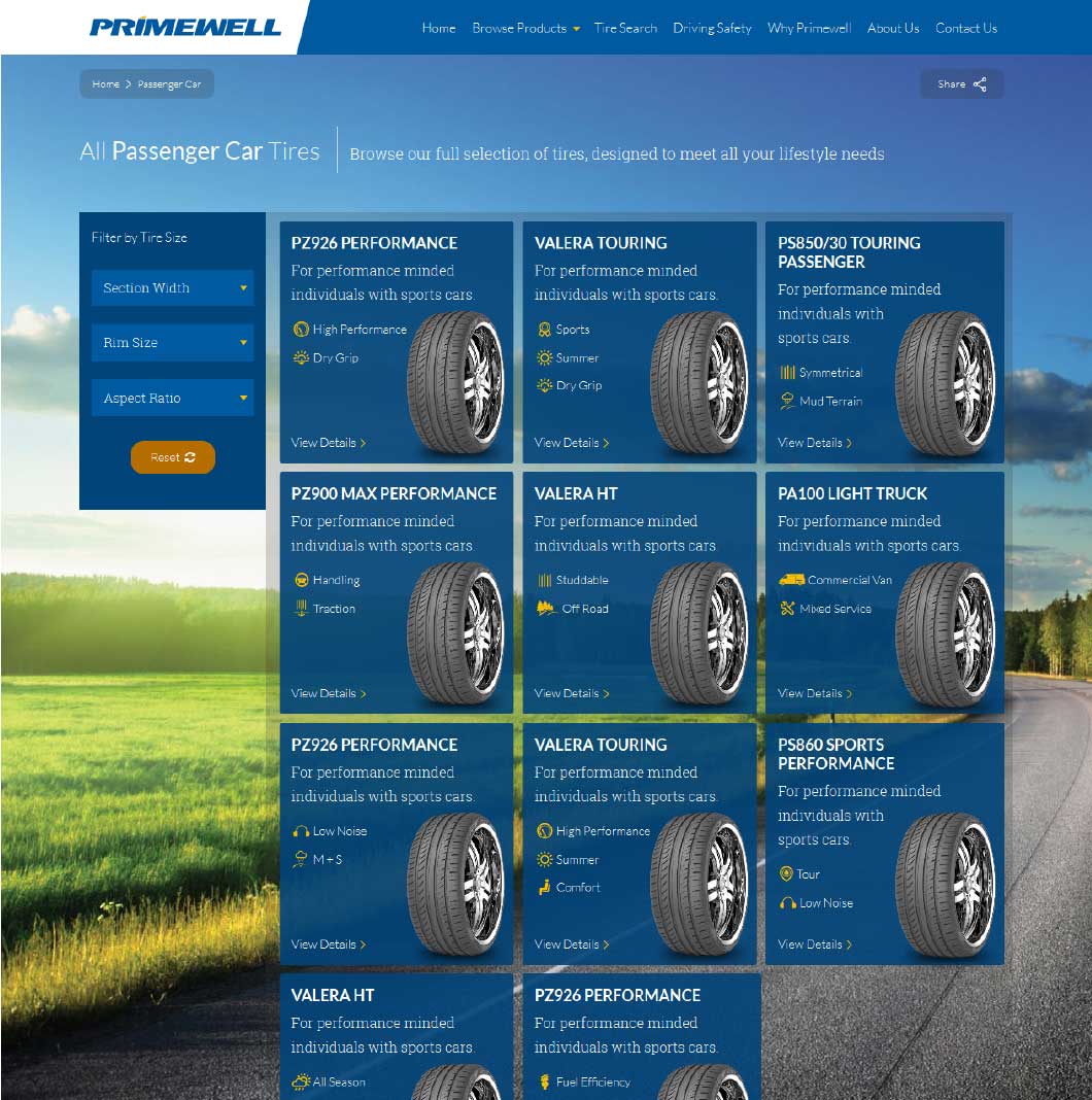 Primewell is a wide-ranging tire brand including tires for passenger cars, trucks and SUV's, commercial vans and buses and long-haul trailer trucks. Our mission was to design a completely new site design and online branding style that fits their niche of a high quality lifestyle brand.