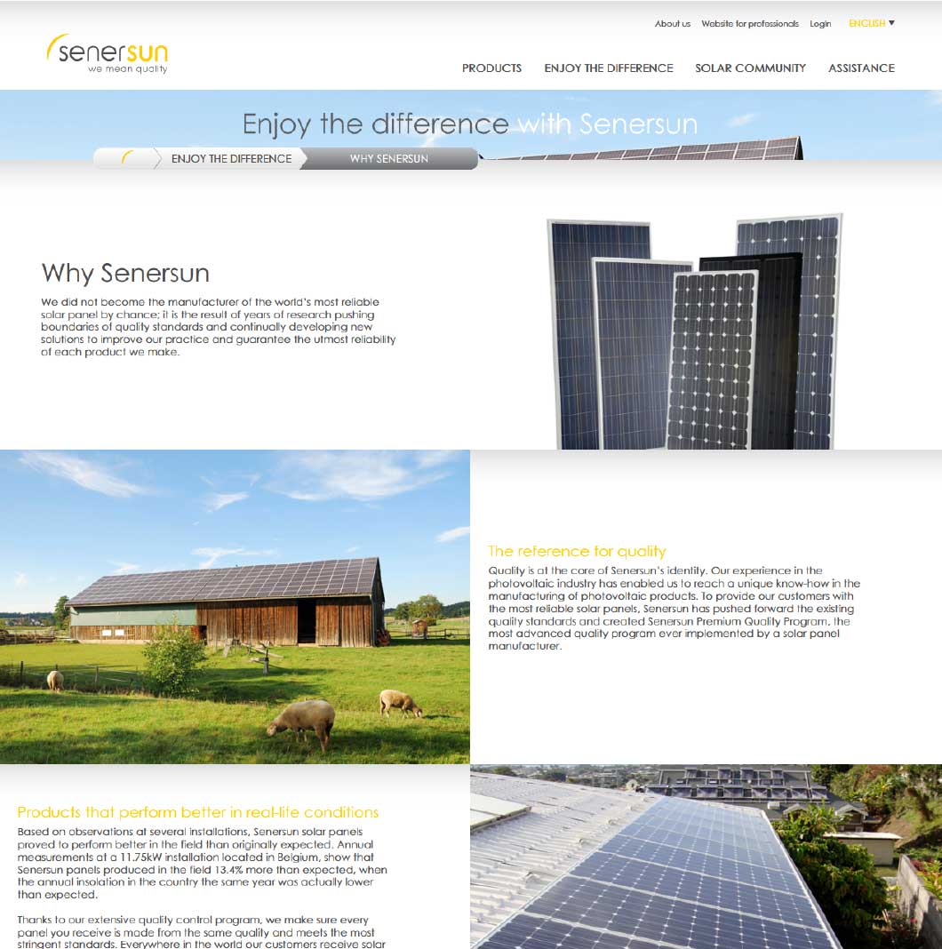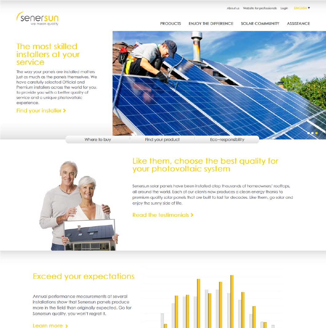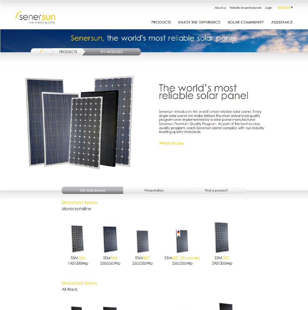Website is Multilingual and made responsive to adapt fluidly on all tablets and mobiles. Complex functions include Members Areas and ability to update and register owner’s solar panels for starting warranty periods and search functions for what panels are available in a visitor’s country and to search for installers in their own country worldwide.